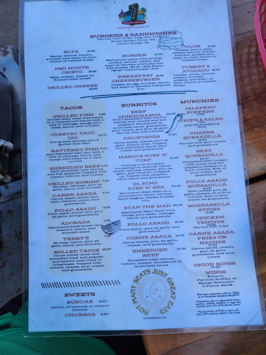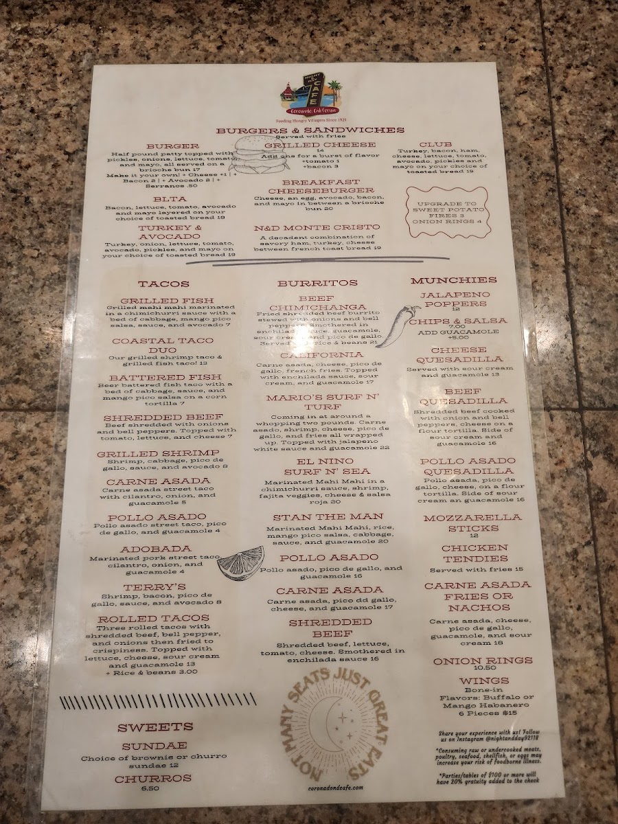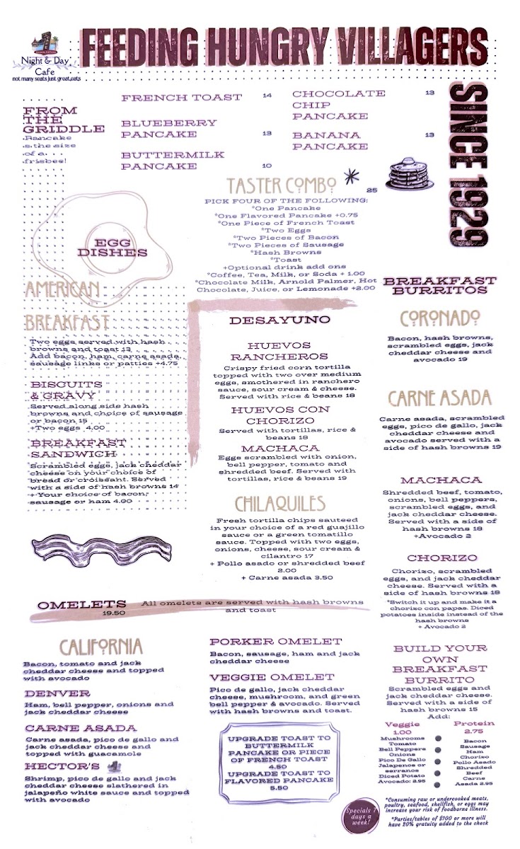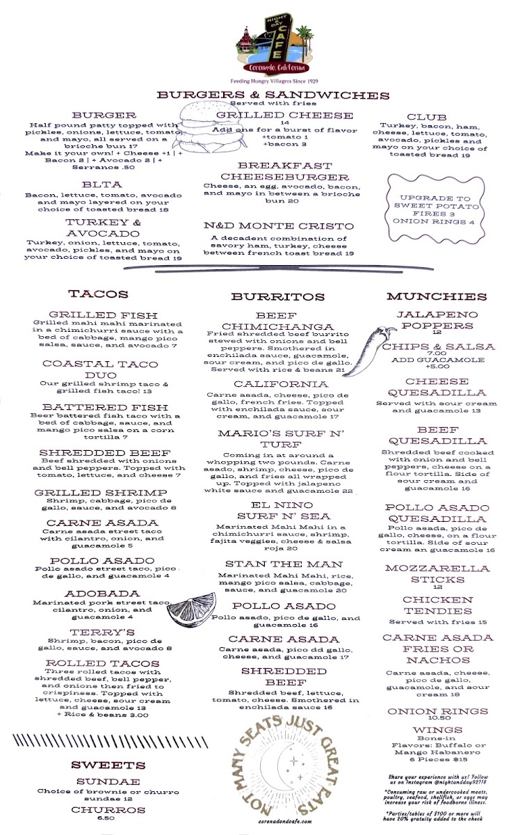The Night & Day Cafe Menu is all about delicious flavors served at any time of day. Nestled at 847 Orange Ave in Coronado, CA, this cafe is a local favorite for both early risers and night owls. Whether you’re stopping by for a hearty breakfast, a mid-day pick-me-up, or a cozy dinner, there’s something here for everyone. Start your morning with their signature coffee and freshly baked pastries, or enjoy a satisfying sandwich or salad for lunch. If you’re craving something a little more indulgent, their dinner options won’t disappoint - think savory pastas, grilled specialties, and irresistible desserts. No matter the time, the menu at Night & Day Cafe has a little something to satisfy every craving, making it a perfect spot to relax and enjoy great food with friends and family.